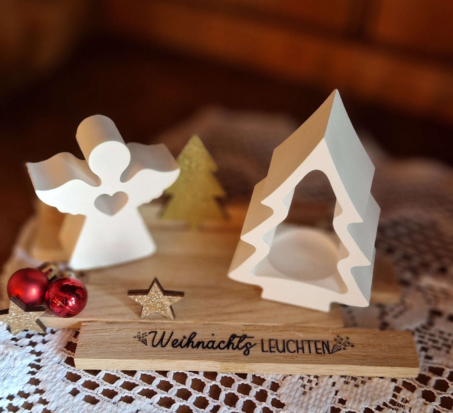 Das sanfte Licht lässt die filigranen Formen erstrahlen und sorgt für eine stimmungsvolle Atmosphäre – ideal für Fensterbank, Kommode oder Esstisch. Die Kombination aus natürlichem Holz, zarten Formen und weihnachtlichen Akzenten schafft ein festliches Highlight in jedem Raum.